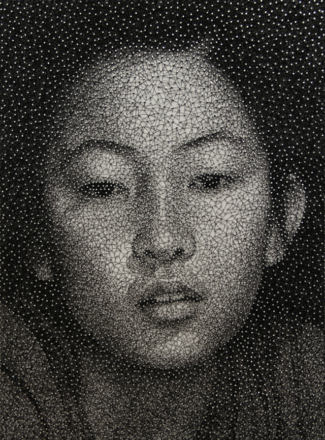 The materials consist of a wooden panel painted a solid white, thousands of small galvanized nails, and a single, unbroken, common sewing thread. Kumi Yamashita created this image and others like it by winding the thread through the array of nails, with the darker and shaded areas created solely by the density of the string and the nails. Amazing stuff. If you doubt me, take a look at the close-up that comes next. Continue reading »