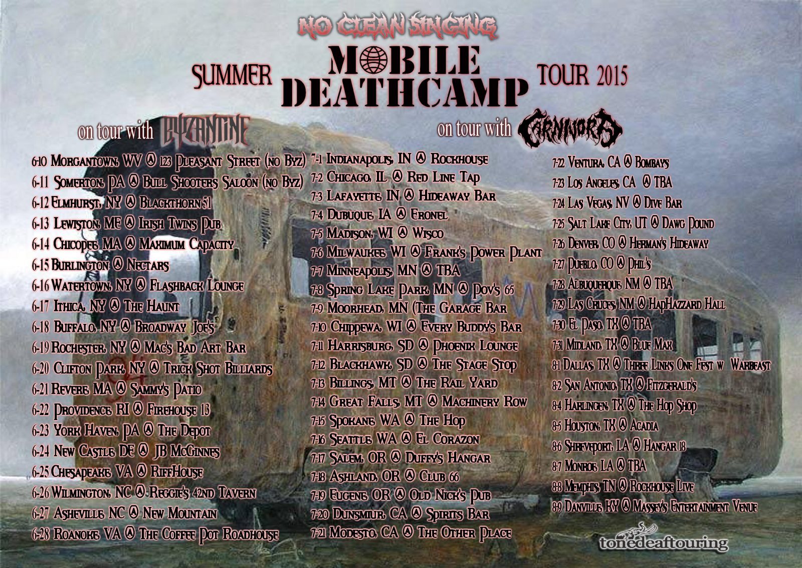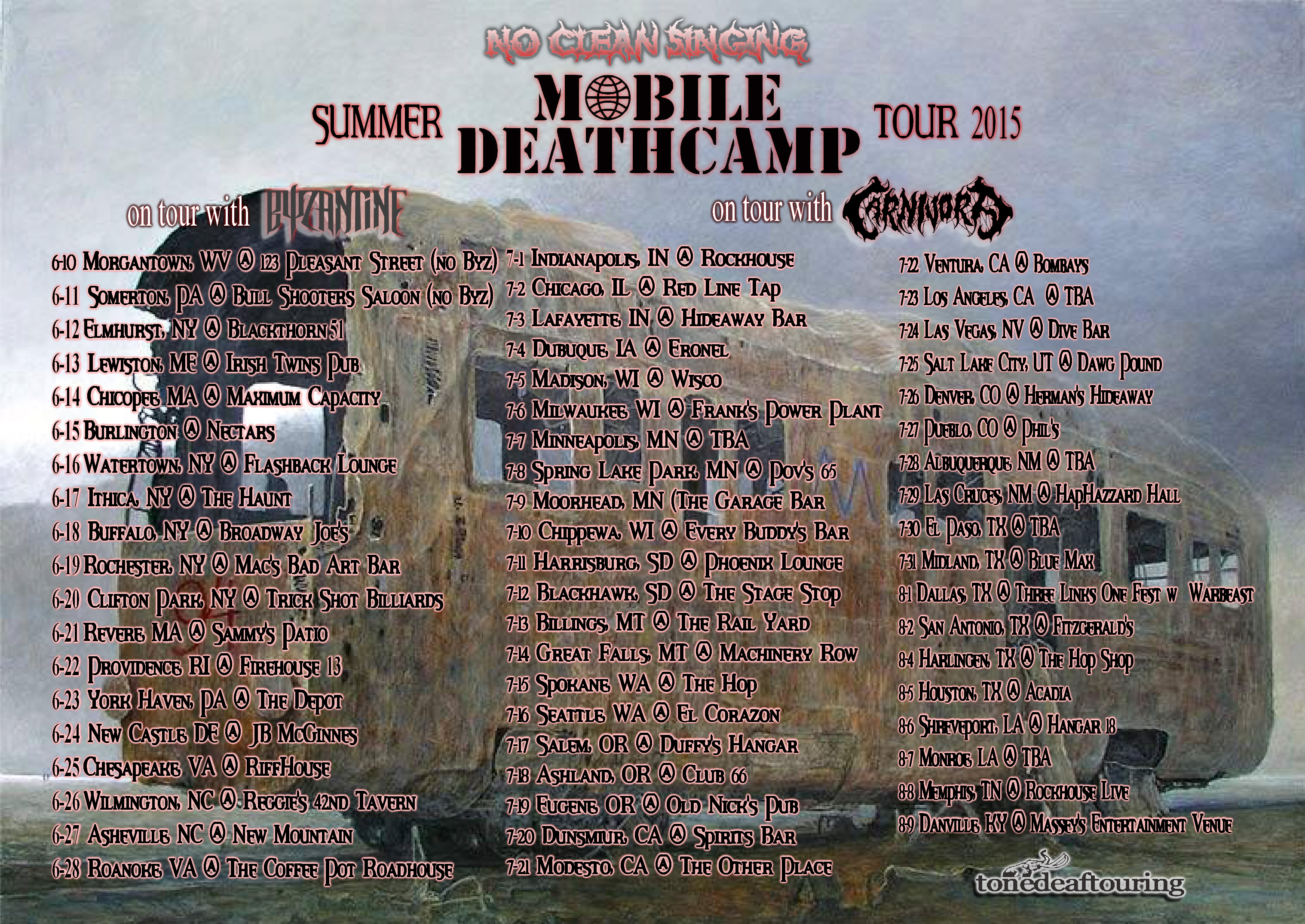 As previously announced, Mobile Deathcamp’s tour with Byzantine will begin on June 12 in Elmhurst, NY, and continues through a date in Asheville, NC, on June 27. And then on July 1, the Mobile Deathcamp-Carnivora onslaught will begin in Indianapolis and continue through August 9 in Danville, Kentucky, with stops in a total of 18 states. To get all the details, click on the flyer above to view an enlarged image — or check the alternate flyer just after the jump. Continue reading »