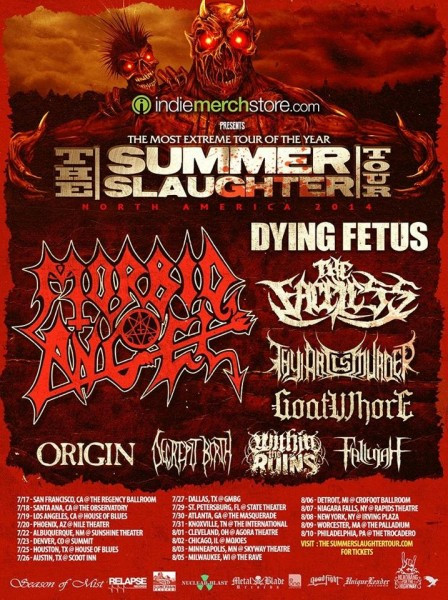 I would like to see the 2014 edition of the SUMMER SLAUGHTER tour. It includes Morbid Angel, Dying Fetus, Goatwhore, Origin, Decrepit Birth, Fallujah, and other bands. I bet it would be a good time. But as much as I would like to see SUMMER SLAUGHTER, SUMMER SLAUGHTER does not want to see me.